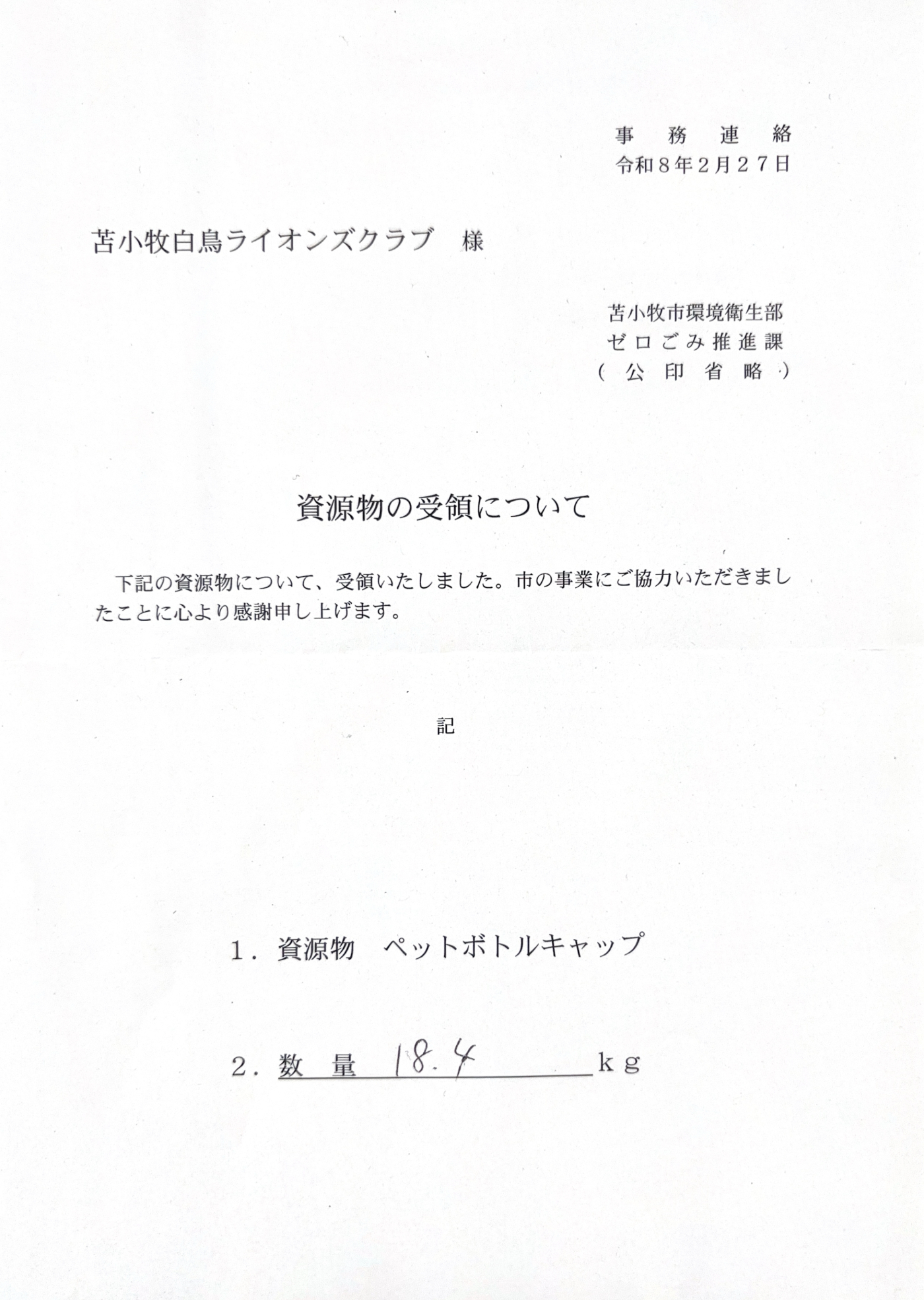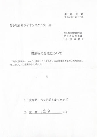 2月 27 資源物回収事業 2026年03月19日(木) アクティビティ 苫小牧白鳥ライオンズクラブ NEW 2/27 ペットボトルキャップ回収事業を行っている苫小牧市へ18.4kg持ち込みました(ポリオワクチン9名分)アクト時間1H